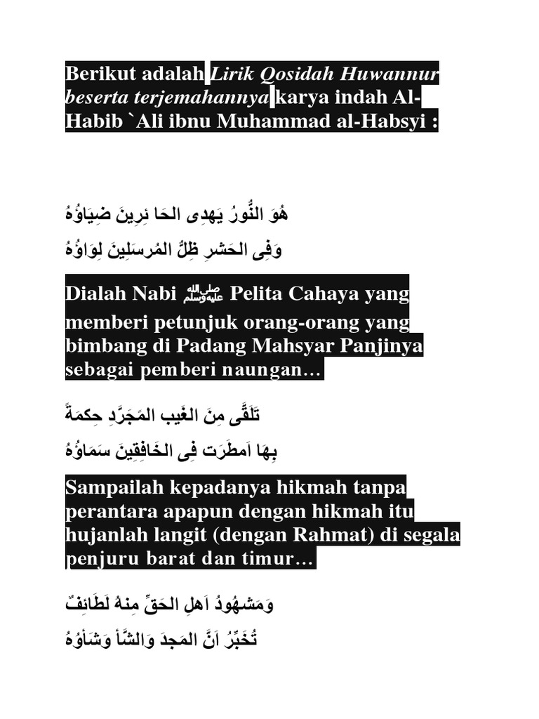 Berikut Adalah Lirik Qosidah Huwannur