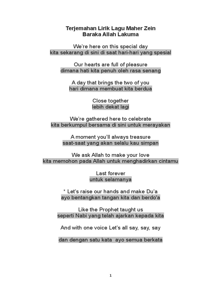 Lirik arab barakallah maher zain. Maher zain baraka allahu lakuma. Our hearts are full of pleasure. Maher zain ya nabi salam alayka arabic ماهر زين يا نبي سلام عليك official music video duration. Barakallah 2x barakallahu lakuumwalanaa allah bariklawhuma allah hadhum hubbahuma allah solli wasallim a la rasulillah allah tub alaina allah irdha anna.