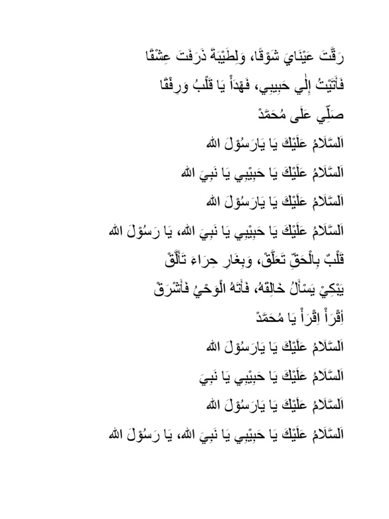 Lirik roqqota aina رقت عيناي شوقا written by عبدالله مستغفرين on 04 october 2012 01 27 qosidah ini berasal dari album mahaer zain sangat menyentuh nan indah dan selain itu juga dilantunkan group sholawat mustamirrut turost its yang menghantarkan masuk juara festival sholawat banjari sunan kalijogo 2012. Qalbun bil haqqi ta allaq wa bi ghari hira a ta allaq yabki yas alu khaliqahu fa atahul wahyu fa ashraq iqra iqra ya muhammad. Lirik sholawat assalamu alaika ya rosulallah roqqota aina assalamualaika ya habibi ya nabiyya allah. Lirik lagu roqqot aina versi sabyan ini merupakan koleksi lirik terbaru 2018 dari kitab lirik lagu untuk mendapatkan lagu assalamu alaika ya rosulalloh roqqot aina anda bisa membelinya melalui media digital seperti itunes jook langit musik spotify deezer dan media pembelian musik lainnya.